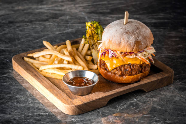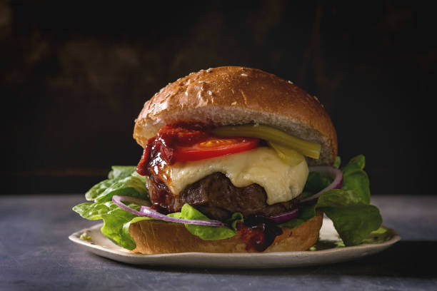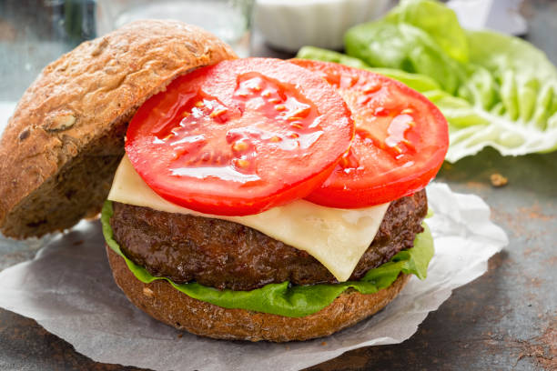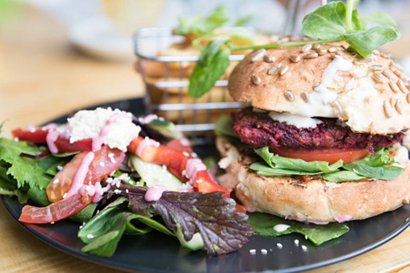 Mix the hummus, yogurt and some seasoning, then spread on both sides of the toasted buns. Put some cabbage on the bottom buns, top with the burgers, a slice of tomato, a pickled chilli, some hot sauce and the bun tops, and serve.